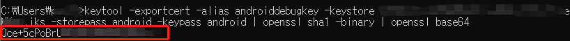 keytool -exportcert -alias androiddebugkey -keystore <debug_keystore_path> -storepass android -keypass android | openssl sha1 -binary | openssl base64