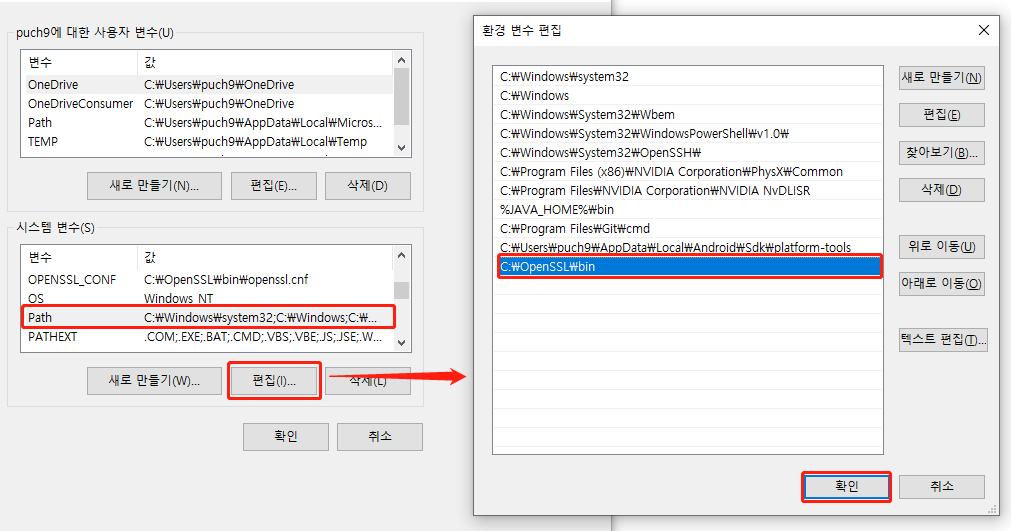 - Path 부분 에 OpenSSL 폴더 안의 bin 폴더 경로 입력 후 저장